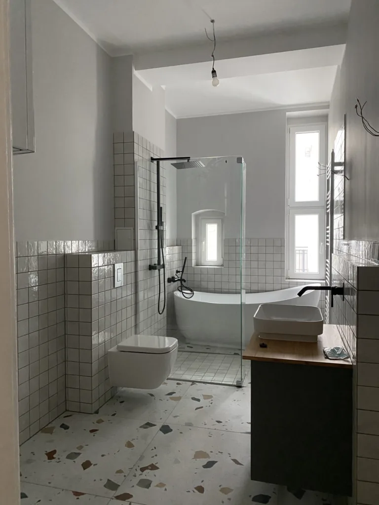 Popis: V tomto starém bytě v Charlottenburgu byly provedeny rozsáhlé práce: v tomto prostorném loftovém bytě, nyní zdobeném moderními mozaikovými dlaždicemi, stylovými koupelnovými armaturami, sprchovým koutem se skleněnou stěnou, muselo být podle statických výpočtů zbouráno mnoho příček bývalých komor a venkovní toalety, aby byl prostor světlejší, prostornější a obyvatelnější. Jedinečný výsledek je příkladem moderní vysoce kvalitní renovace a modernizace obytného domu.